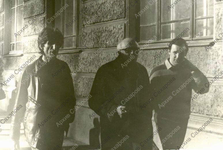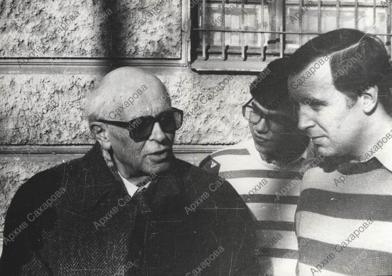 Две фотографии А.Д.Сахарова у здания физфака МГПИ в день заседания, посвященного 100-летию со дня рождения Д.И.Сахарова, в группах людей