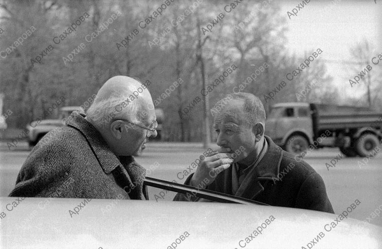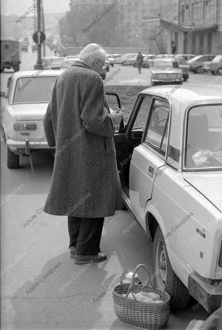Две фотографии А.Д.Сахарова у дома, около своей автомашины (на одной - с неизвестным)