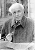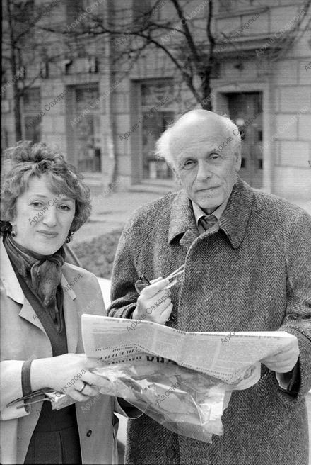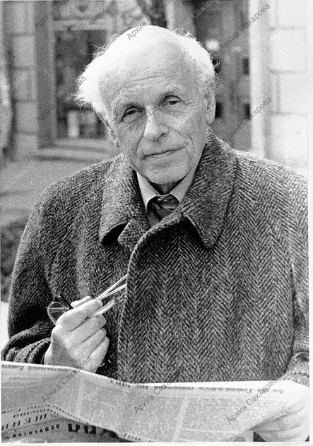 Фотография А.Д.Сахарова перед подъездом своего дома, с газетой в руках