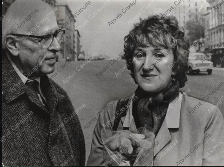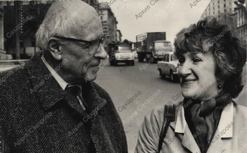 Две фотографии А.Д.Сахарова с Г.В.Старовойтовой у своего дома на улице Чкалова