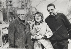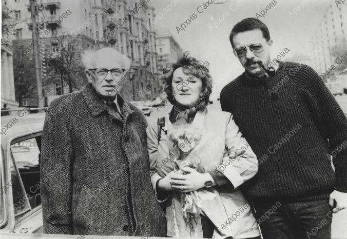 Фотография А.Д.Сахарова с Г.В.Старовойтовой и Ю.М.Ростом у своего дома на улице Чкалова