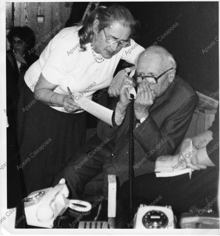 Фотография А.Д.Сахарова и Е.Г.Боннэр во время телефонного разговора с Москвой из больницы в Тбилиси по делам Общественной комиссии по расследованию событий 9 апреля 1989 г.