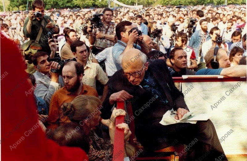 Фотография А.Д.Сахарова на трибуне во время митинга в Лужниках 28 мая 1989 г., с группой людей