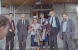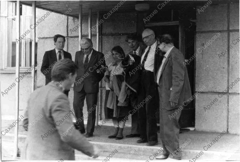 Три фотографии А.Д.Сахарова с Р.И.Пименовым и В.А.Пименовой в Сыктывкаре во время поездки для поддержки Р.И.Пименова на выборах народных депутатов СССР, в группе людей