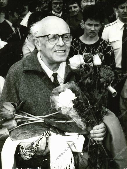 Фотография А.Д.Сахарова после прилета в Сыктывкар для поддержки Р.И.Пименова на выборах народных депутатов СССР, в группе людей