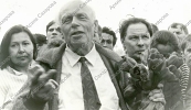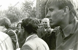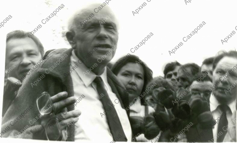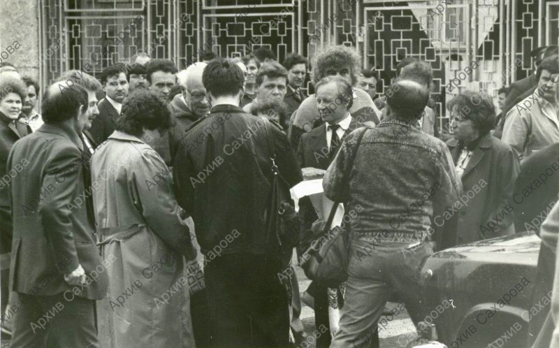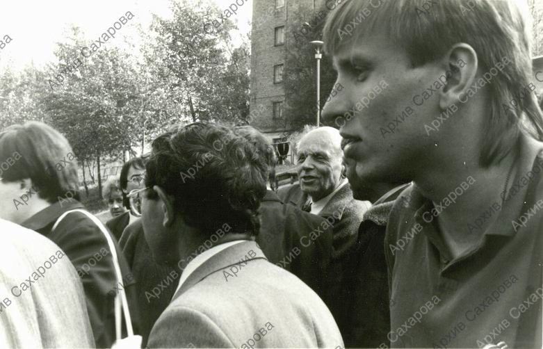 Пять фотографий А.Д.Сахарова после прилета в Сыктывкар для поддержки Р.И.Пименова на выборах народных депутатов СССР, в группах людей