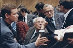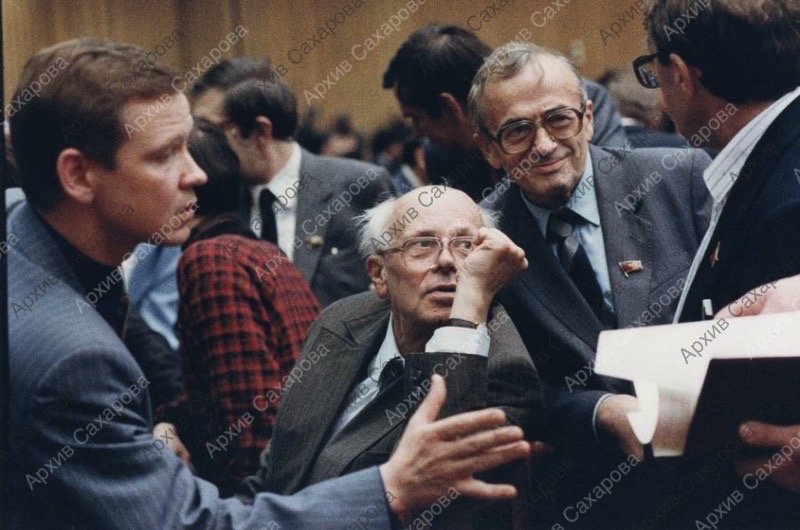 Фотография А.Д.Сахарова в перерыве между заседаниями Съезда народных депутатов СССР, с С.Б.Станкевичем, В.И.Гольданским и др.