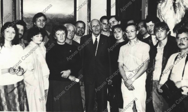 Фотография А.Д.Сахарова и Г.В.Старовойтовой в свердловском Музее истории комсомола, с группой людей