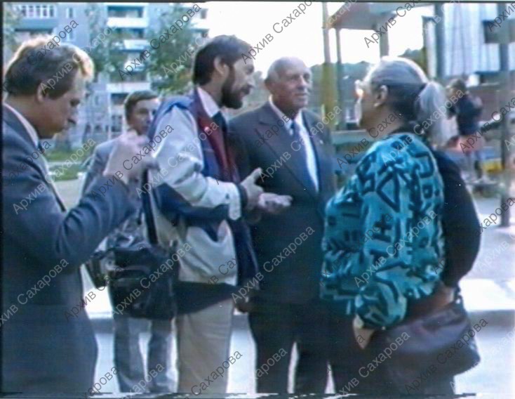 Восемь фотографий А.Д.Сахарова, Е.Г.Боннэр и Г.В.Старовойтовой во время встречи с членами Молодежного жилищного кооператива в Свердловске, в группах людей