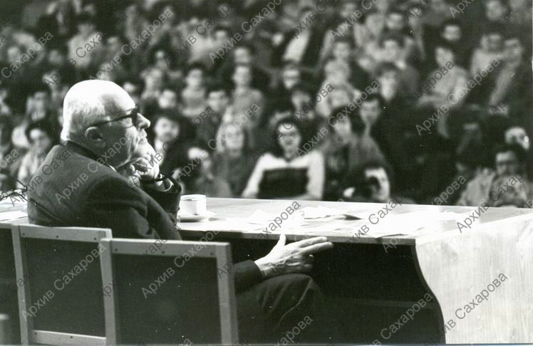 Фотография А.Д.Сахарова перед залом с людьми во время встречи с челябинцами в Доме политпросвещения Челябинского обкома КПСС
