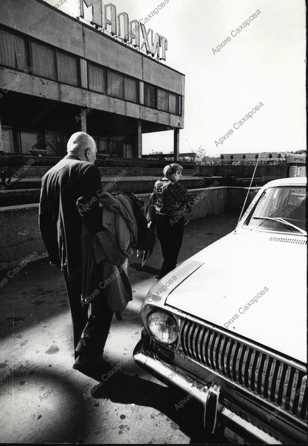 Фотография А.Д.Сахарова и Е.Г.Боннэр в Челябинске около гостиницы "Малахит"