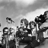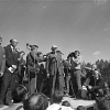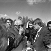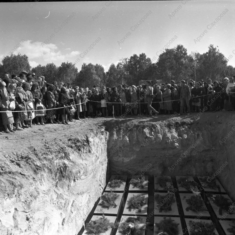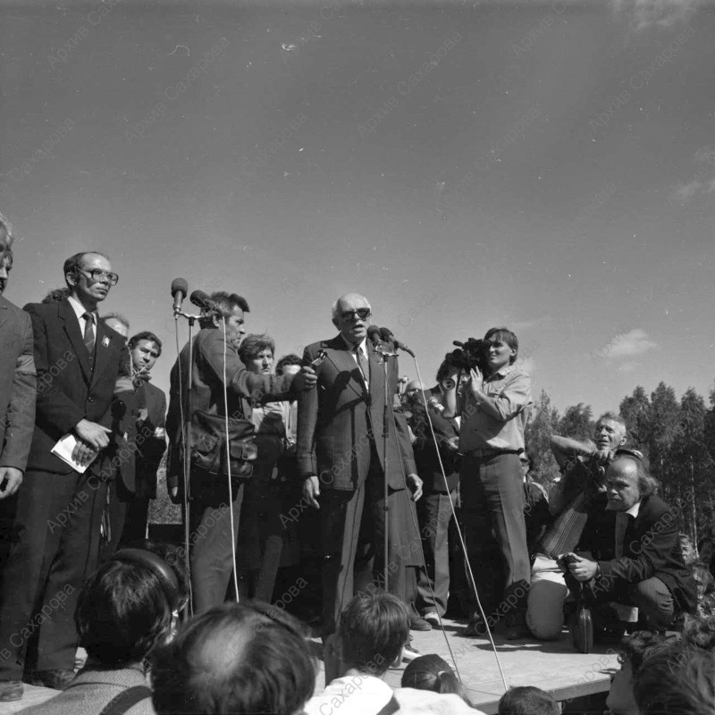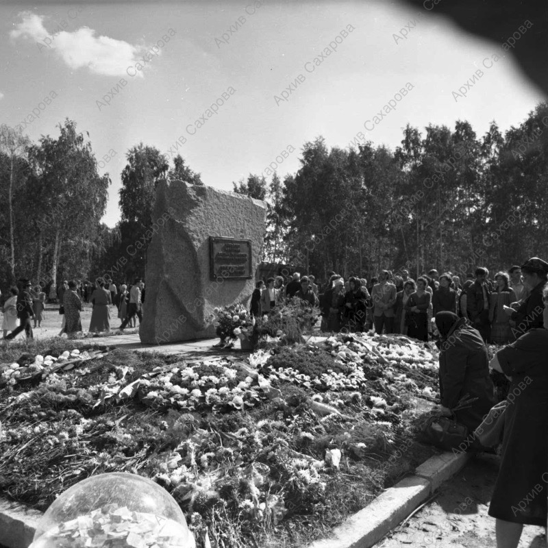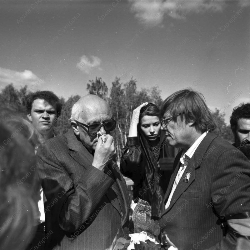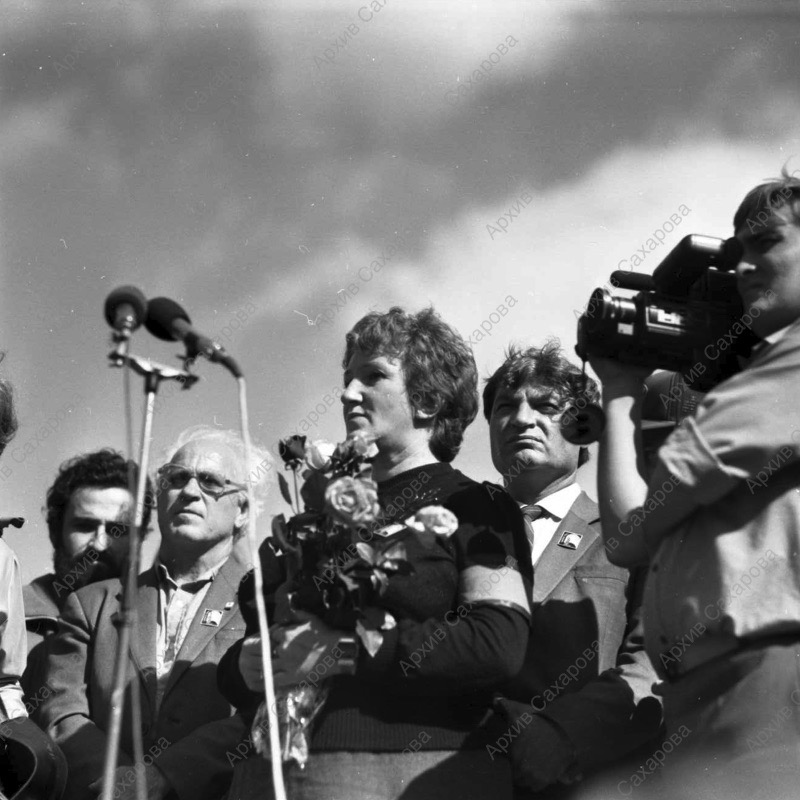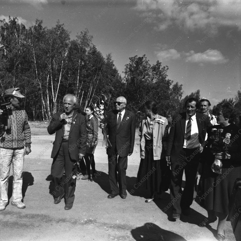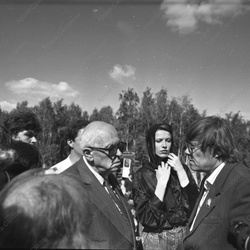 Пять фотографий А.Д.Сахарова и фотография Г.В.Старовойтовой на церемонии перезахоронения жертв политических репрессий на Золотой горе недалеко от Челябинска, в группах людей