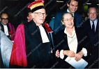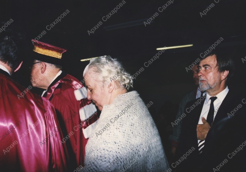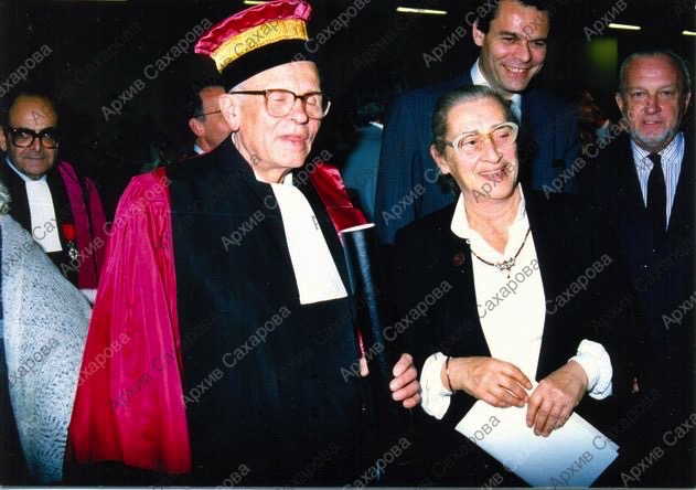 Четыре фотографии А.Д.Сахарова и Е.Г.Боннэр после церемонии вручения Сахарову знаков отличия степени доктора honoris causa университета Клода Бернара (Лион), в группах людей