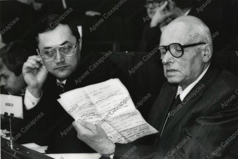 Фотография А.Д.Сахарова в зале заседаний второй сессии Верховного Совета СССР, с черновиком выступления по проекту Закона СССР о порядке разрешения коллективных трудовых споров