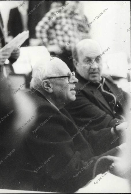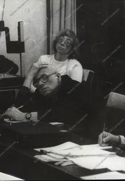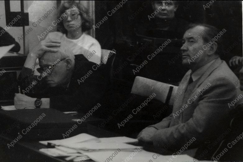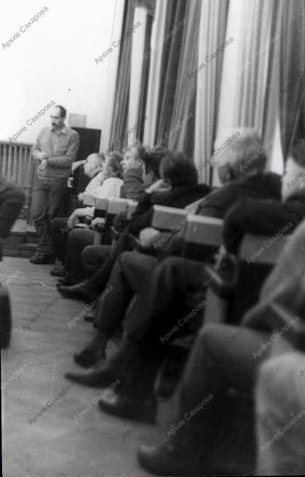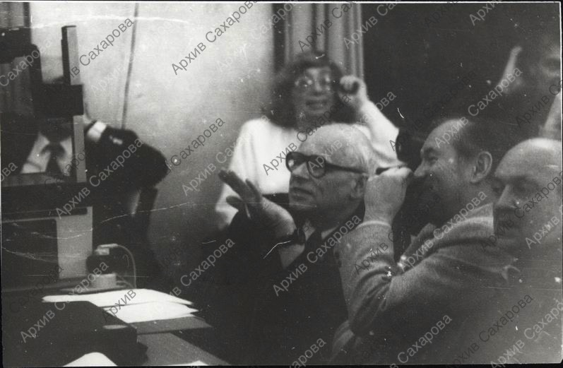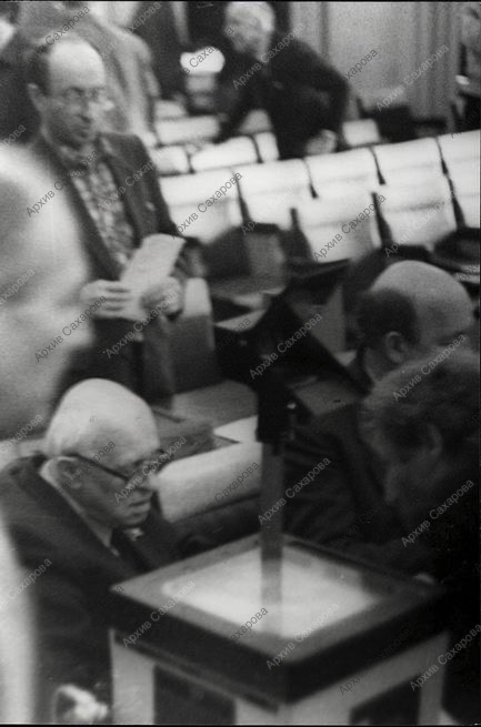 Семь фотографий А.Д.Сахарова на заседании Научного совета по космомикрофизике в Государственном астрономическом институте им. П.К.Штенберга, в группах людей