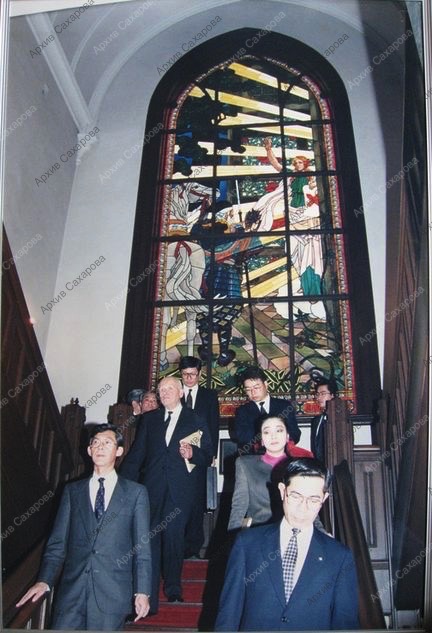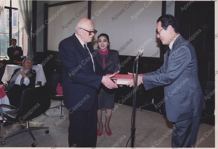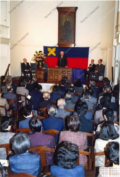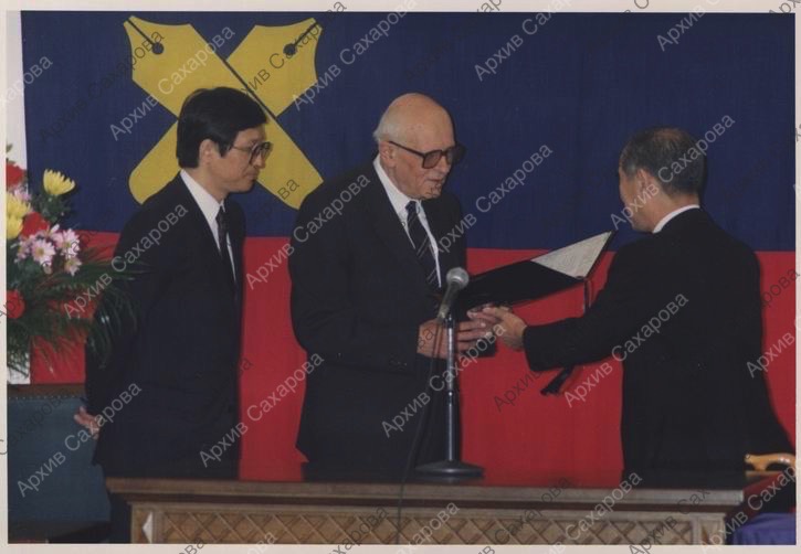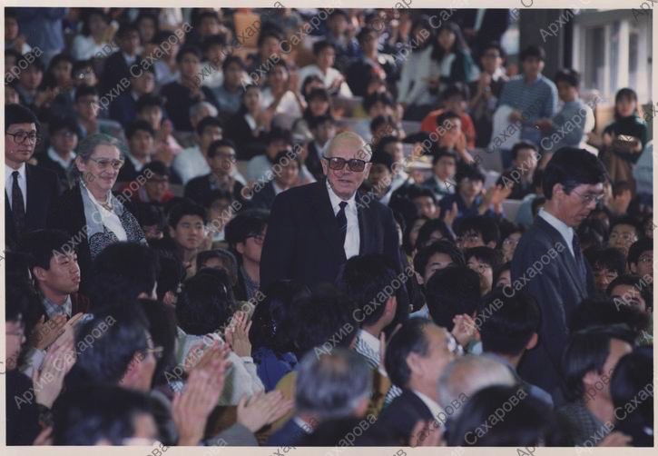 Шесть фотографий А.Д.Сахарова в университете Кэйо-Гидзюку (Токио) в день вручения ему знаков почетной степени доктора права, в группах людей