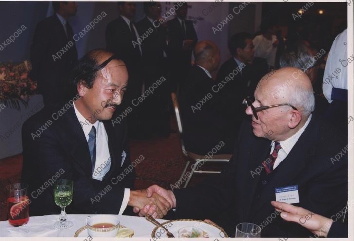 Фотография А.Д.Сахарова и японского физика Хидецуми Теразава во время банкета в день открытия Второго форума нобелевских лауреатов в Японии