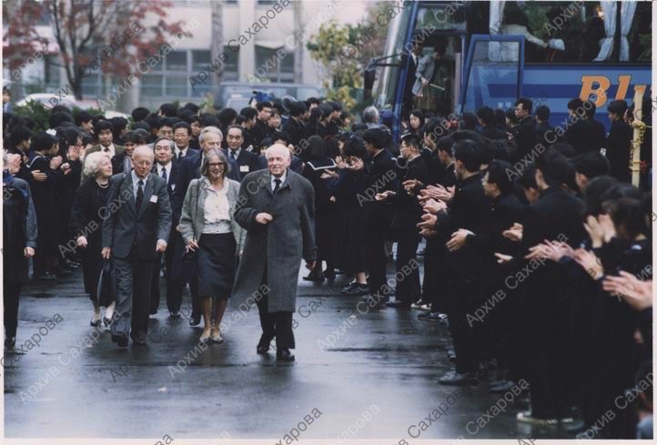 Фотография А.Д.Сахарова и других участников Второго форума нобелевских лауреатов во время их прибытия в школу высшей ступени города Саппоро