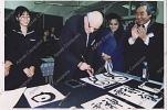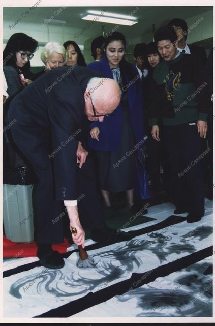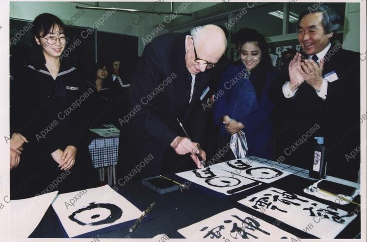 Две фотографии А.Д.Сахарова с учениками школы города Саппоро на "уроке японской каллиграфии"