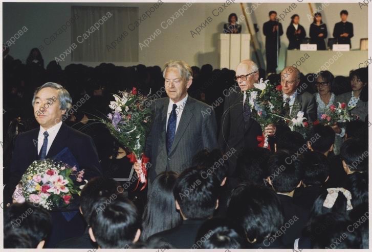 Фотография А.Д.Сахарова и других участников Второго форума нобелевских лауреатов после окончания встречи с учениками школы города Саппоро