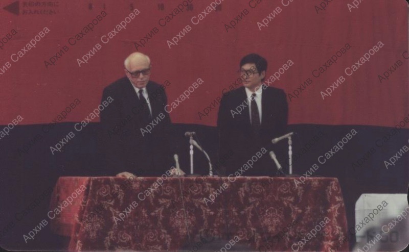 Фотография А.Д.Сахарова во время одного из выступлений в Японии, с неизвестным