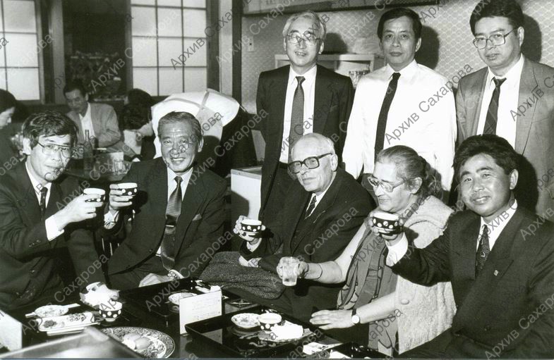 Три фотографии А.Д.Сахарова и Е.Г.Боннэр в японском ресторане в Хиросиме, в группах людей