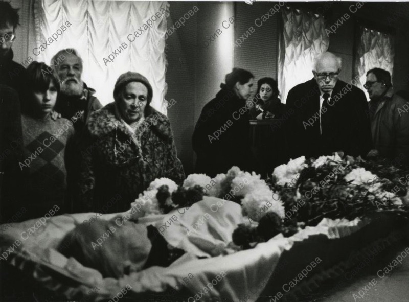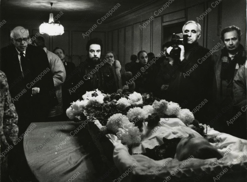 Две фотографии А.Д.Сахарова на гражданской панихиде по С.В.Каллистратовой в Коллегии адвокатов, в группах людей