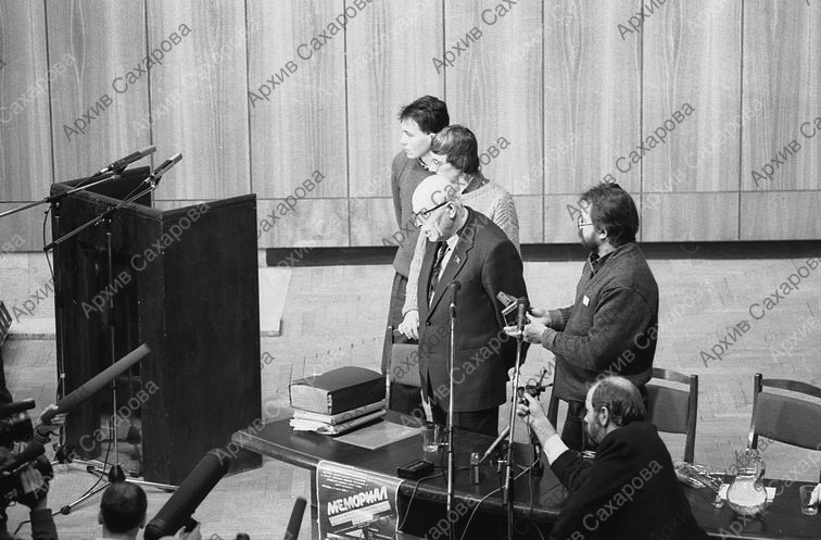 Шесть фотографий А.Д.Сахарова во время передачи ему подписей, собранных "Мемориалом" под "Декретом о власти"