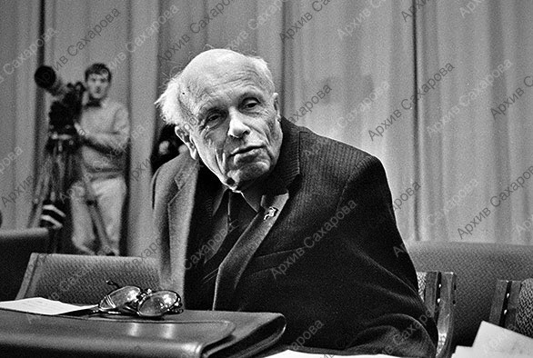 Фотография А.Д.Сахарова в президиуме во время общего собрания Межрегиональной депутатской группы