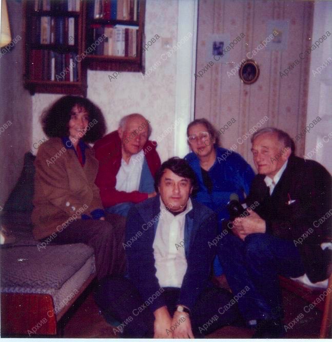 Фотография А.Д.Сахарова и Е.Г.Боннэр дома в комнате, с В.Л.Синельниковым и двумя неизвестными
