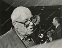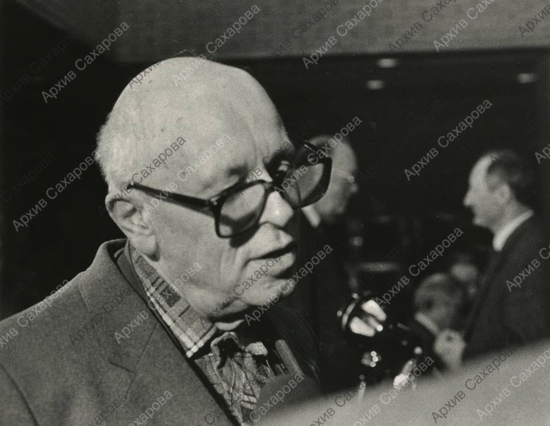 Фотография А.Д.Сахарова перед микрофоном во время беседы с журналистами