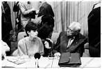 Фотография А.Д.Сахарова и И.Боганцевой в президиуме какого-то собрания, в группе людей
