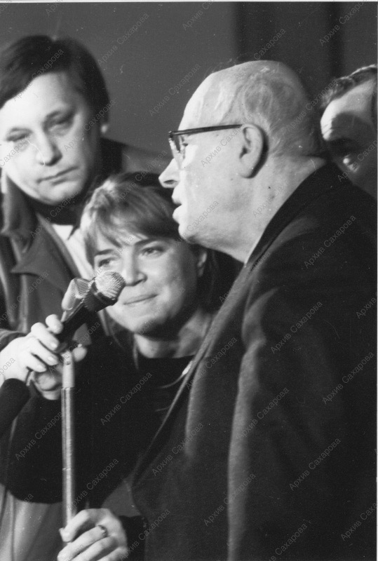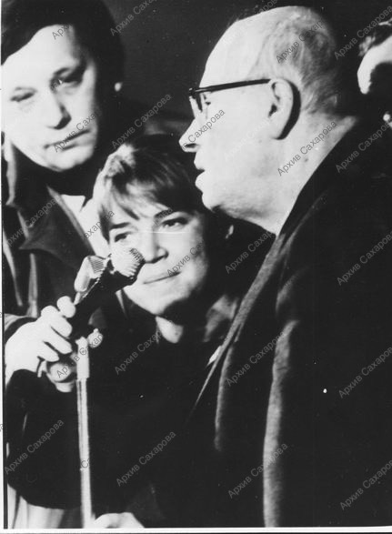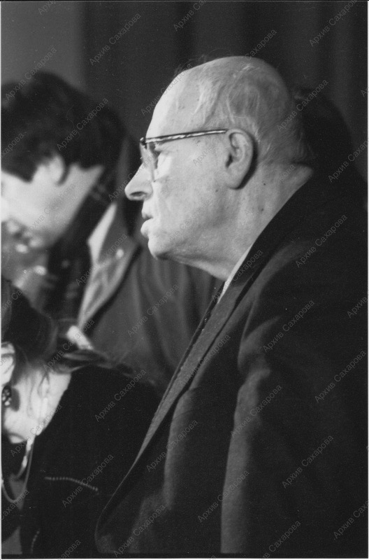 Две фотографии А.Д.Сахарова на собрании по его выдвижению кандидатом в народные депутаты СССР в Центральном доме кинематографистов, в группе людей