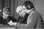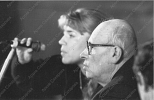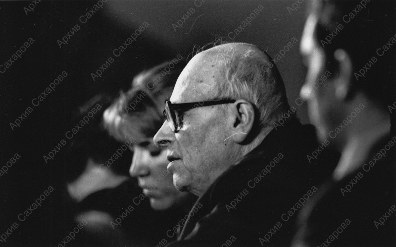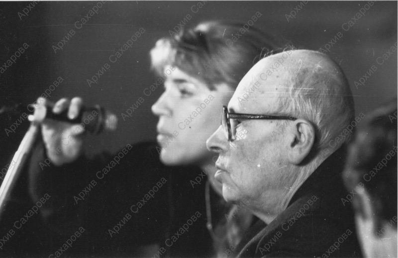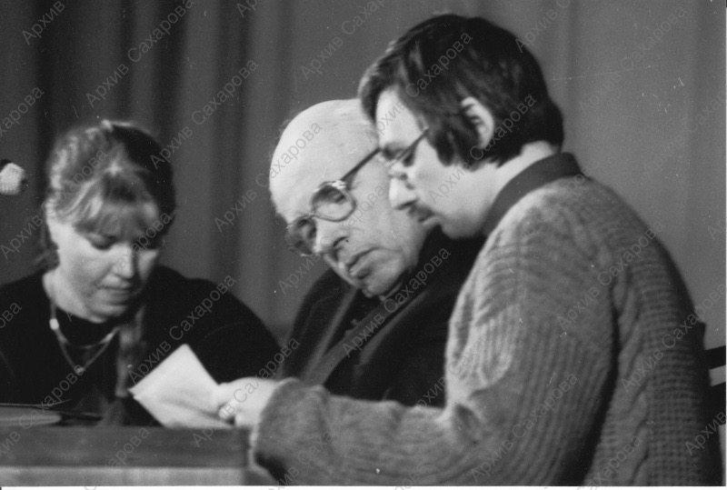 Три фотографии А.Д.Сахарова на собрании по его выдвижению кандидатом в народные депутаты СССР в Центральном доме кинематографистов, с Е.Б.Жемковой и О.П.Орловым