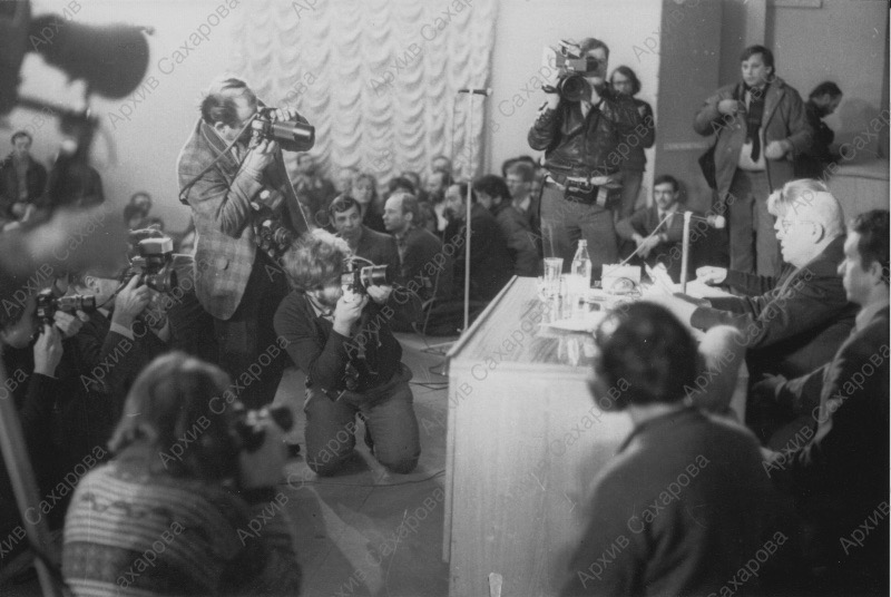 Три фотографии А.Д.Сахарова на собрании по его выдвижению кандидатом в народные депутаты СССР в Центральном доме кинематографистов, во время ответов на вопросы