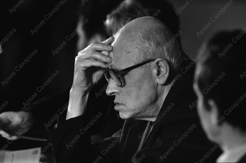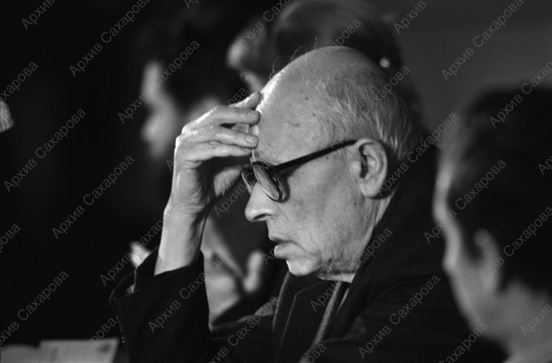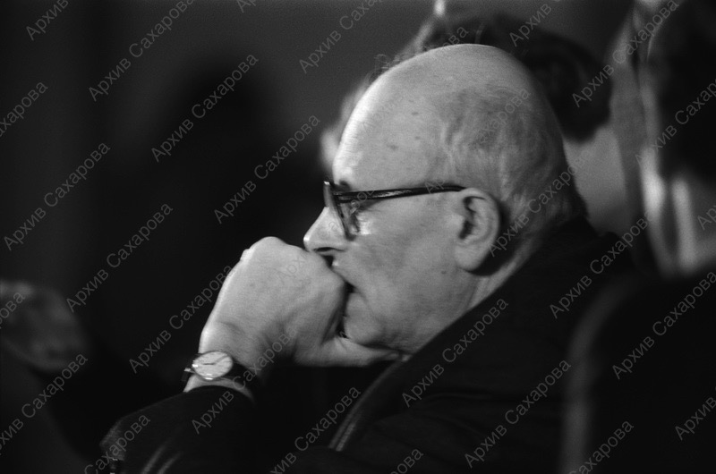 Три фотографии А.Д.Сахарова на собрании по его выдвижению кандидатом в народные депутаты СССР в Центральном доме кинематографистов (портреты в профиль)