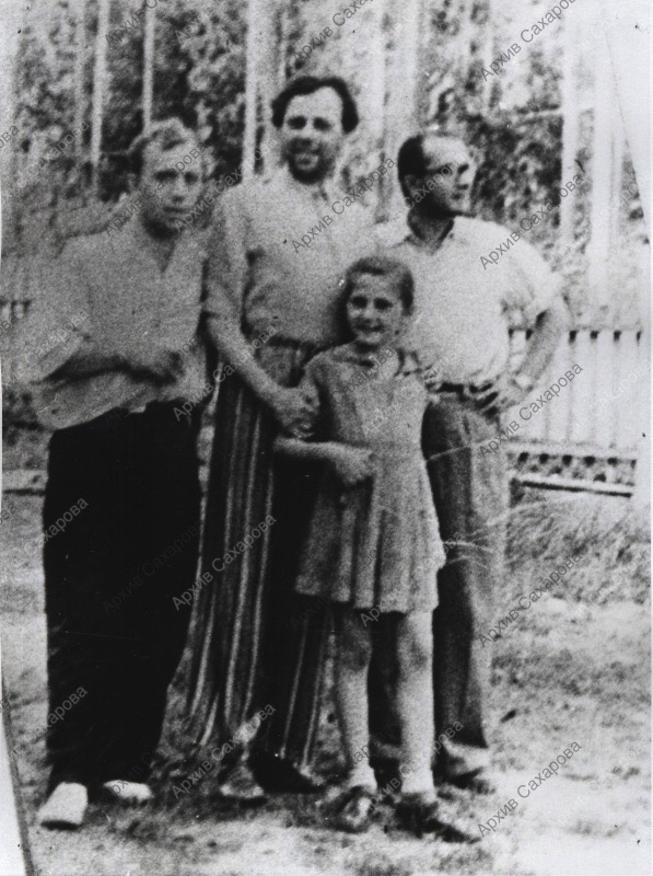 Слева направо: Ю.А.Романов, А.Д.Сахаров, Ю.А.Зысин, впереди - Таня Сахарова
