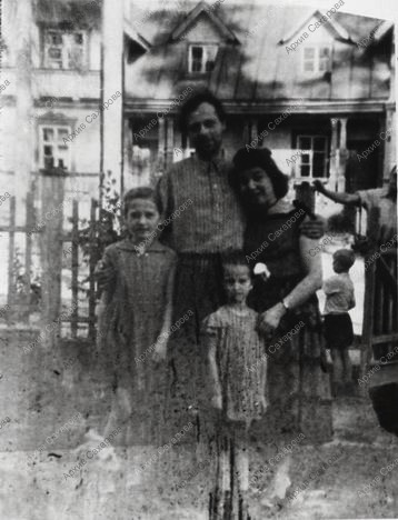 Фотография А.Д.Сахарова с женой К.А.Вихиревой и дочерьми Таней и Любой во дворе их дома на "объекте". 1954-1955 гг.(?)