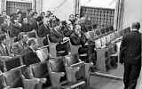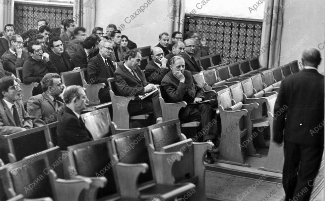 Фотография А.Д.Сахарова на семинаре в ФИАНе, в группе с В.Л.Гинзбургом, Е.М.Лифшицем, Н.Н.Мейманом, И.И.Ройзеном, Ю.Б.Харитоном и др.