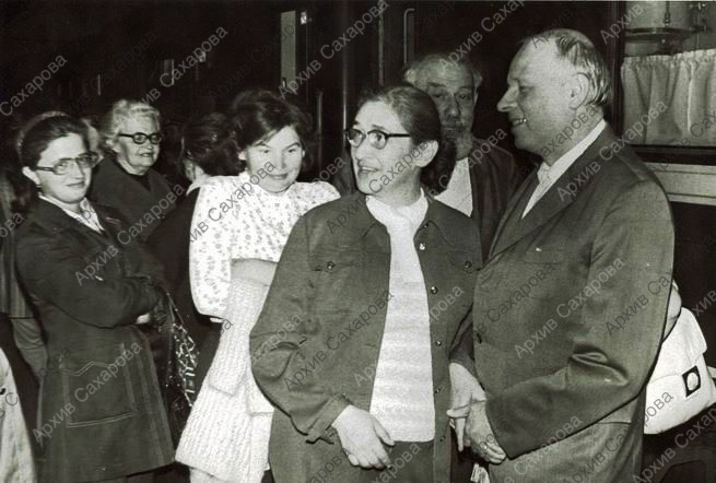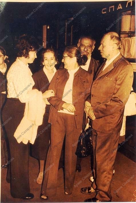 Две фотографии А.Д.Сахарова и Е.Г.Боннэр на Белорусском вокзале перед ее отъездом за границу на лечение, в группе людей