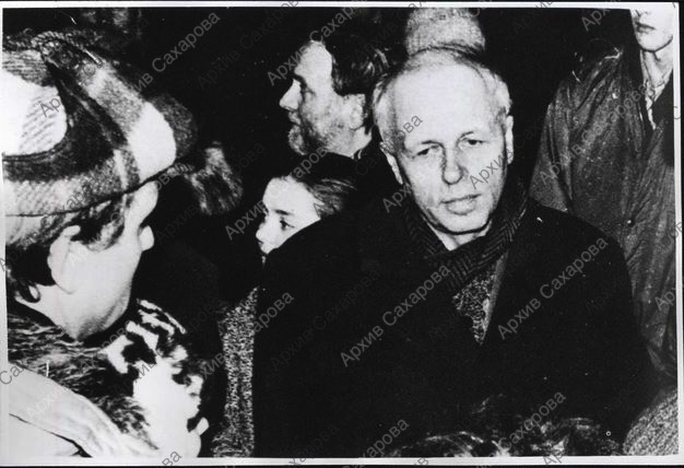Фотография А.Д.Сахарова во время ежегодной демонстрации на Пушкинской площади в Москве, в группе людей. 1975 г.