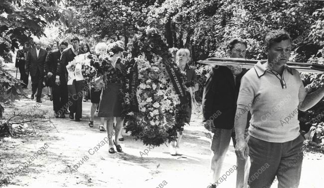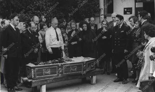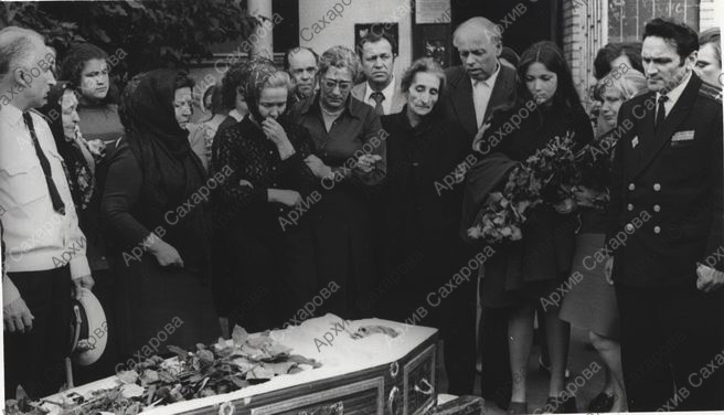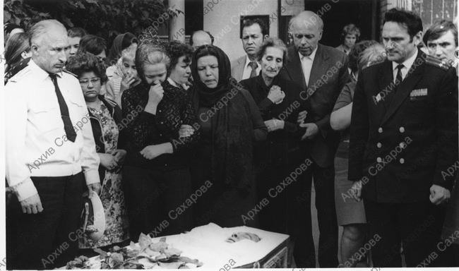 Четыре фотографии А.Д.Сахарова на похоронах брата Е.Г.Боннэр И.Г.Алиханова, в группах людей