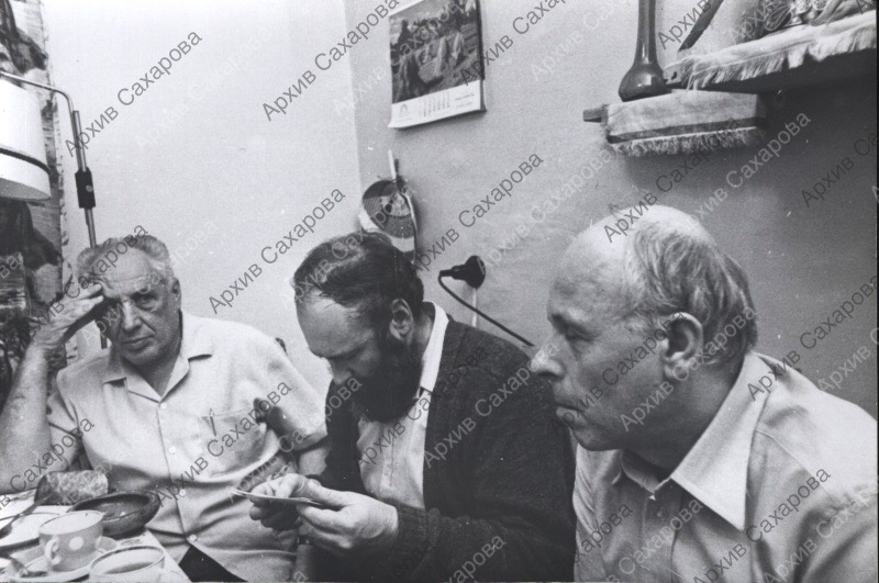 Фотография А.Д.Сахарова дома на кухне с Б.Г.Заксом и В.Н.Корниловым