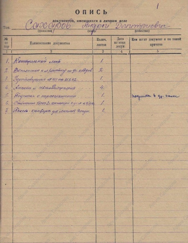 Опись документов в личном деле Сахарова А.Д. на момент оформления его поступления на завод