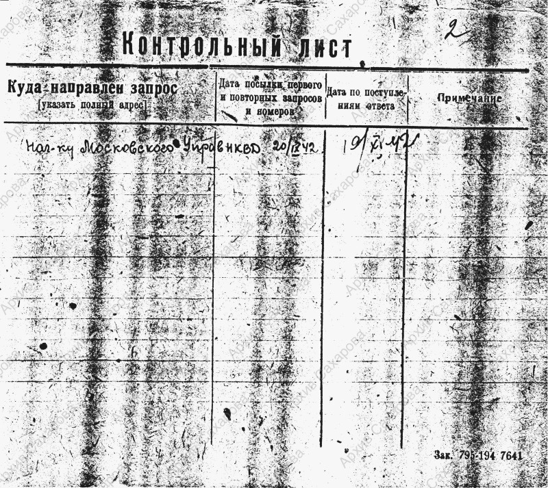 Документ в личном деле Сахарова А.Д. с датами отправленного заводом запроса в московское управление НКВД и полученного ответа