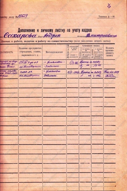 сканированный документ из "Личного дела" А.Д.Сахарова в музее Ульяновского машиностроительного завода им. Володарского (поступление 2018 г.)