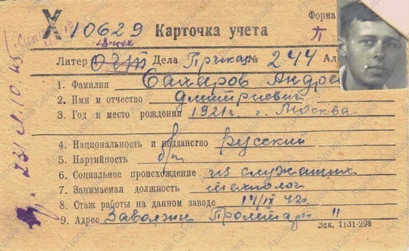 сканированный документ из "Личного дела" А.Д.Сахарова в музее Ульяновского машиностроительного завода им. Володарского (поступление 2018 г.)