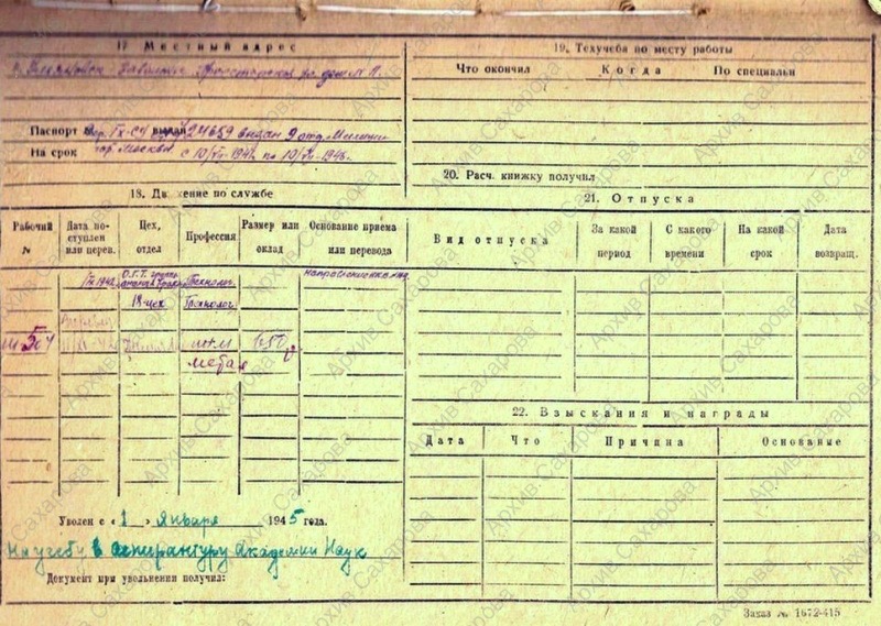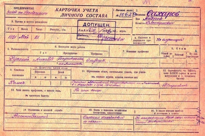 сканированный документ из "Личного дела" А.Д.Сахарова в музее Ульяновского завода им. Володарского (поступление 2018 г.)