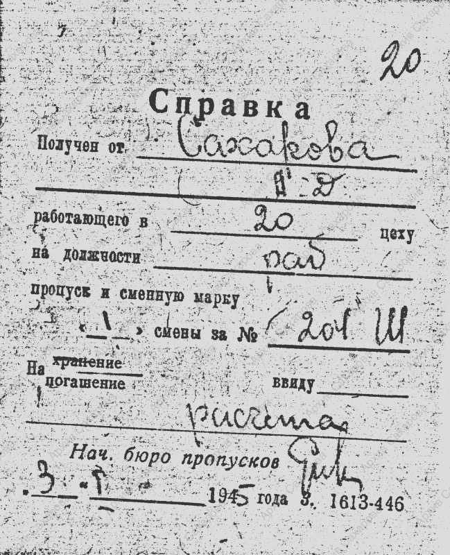 Справка начальника бюро пропусков о полученом от Сахарова А.Д. пропуске за №204-Ш в виду расчета