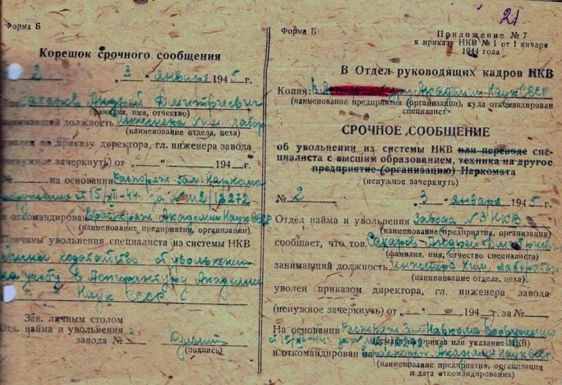 Срочное сообщение в Отдел руководящих кадров НКВ об увольнении из системы НКВ специалиста с высшим образованием Сахарова А.Д., занимавшего должность инженера Хим. лаборатории завода №3 НКВ